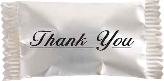 Say “Thank You” with a refreshing, creamy white buttermint candy blended with a buttery richness! Individually wrapped stock logo printed mints. Comes in Standard White Wrapper with Standard PMS color imprint. Stock wrappers are perfect for tight budgets!