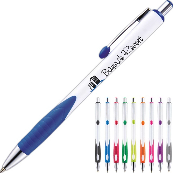 The Desoto Ballpoint Pen is sleek, stylish and affordable. Colors leap from accents around the plunger, clip and barrel. The co-molded grip matches the "Dot" clip tip that aids in easy removal from your pocket. Default ink color is black but blue refills are available.