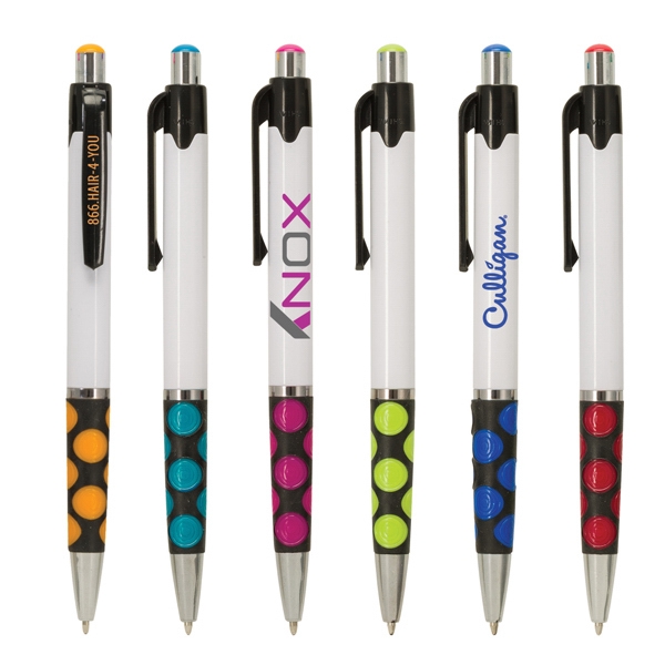 Madeline ballpoint pen with black clip and vibrant colored grip. Medium point black ink,